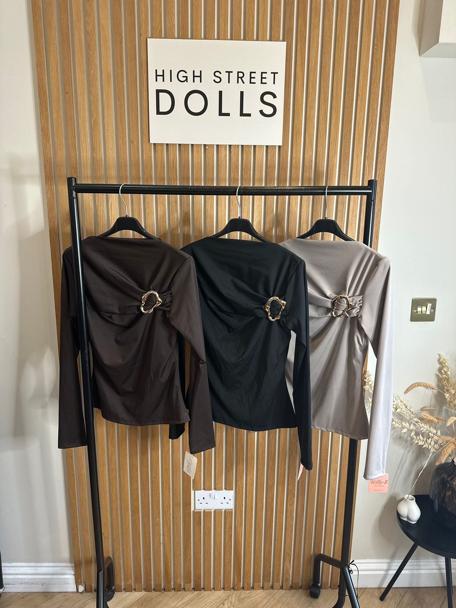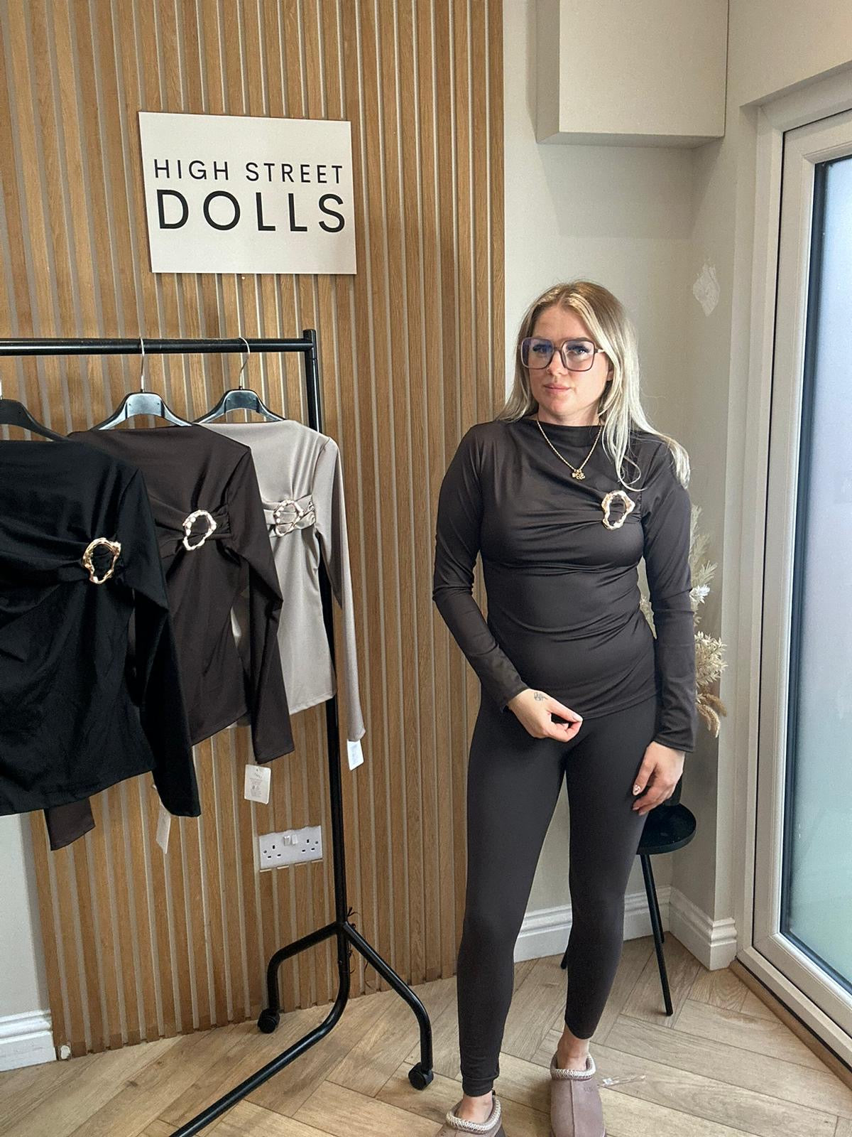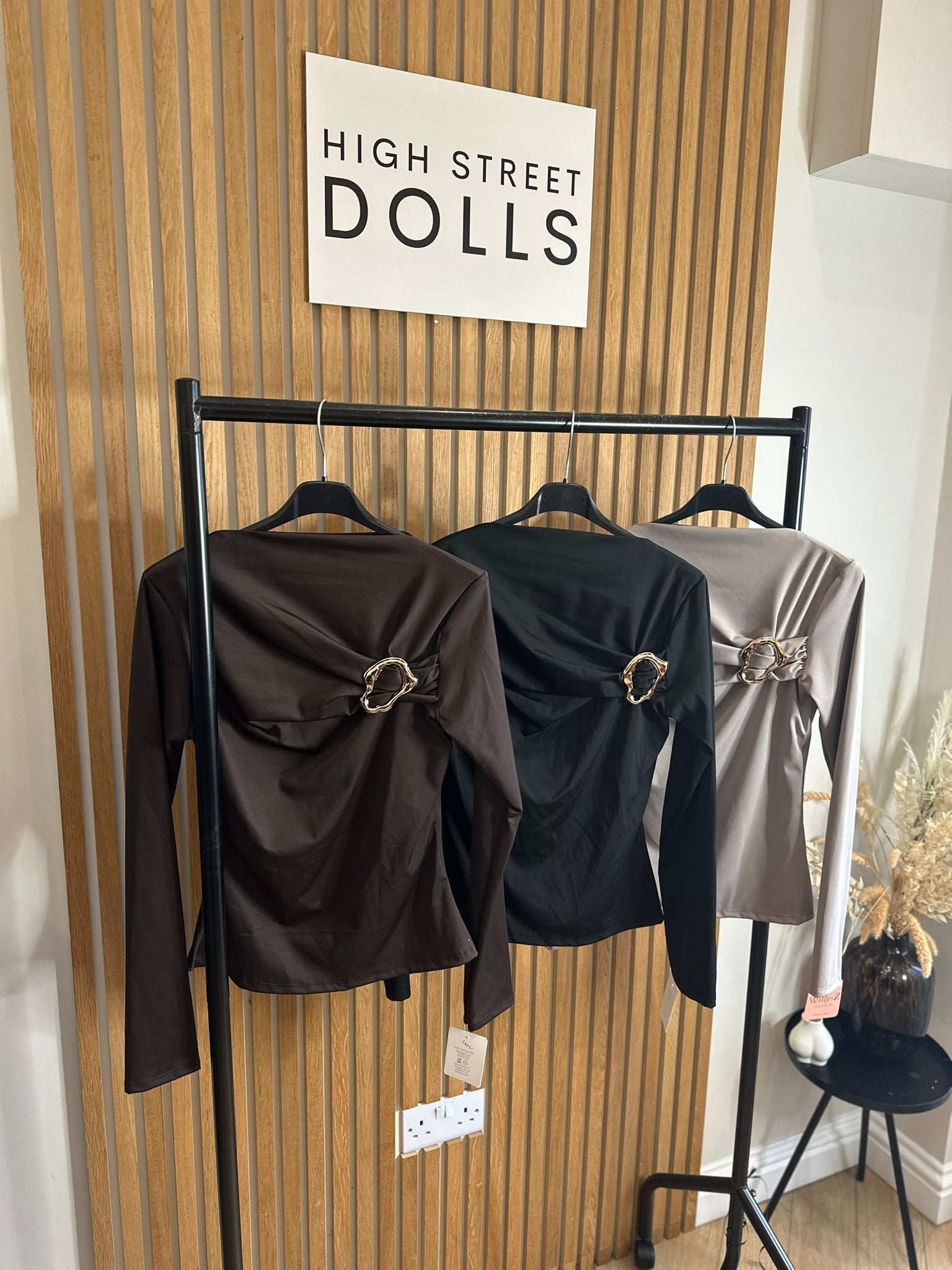 Heidi Long Sleeve Fitted Top High Neckline Autumn Winter Fashion Gold Broach Ruched Top