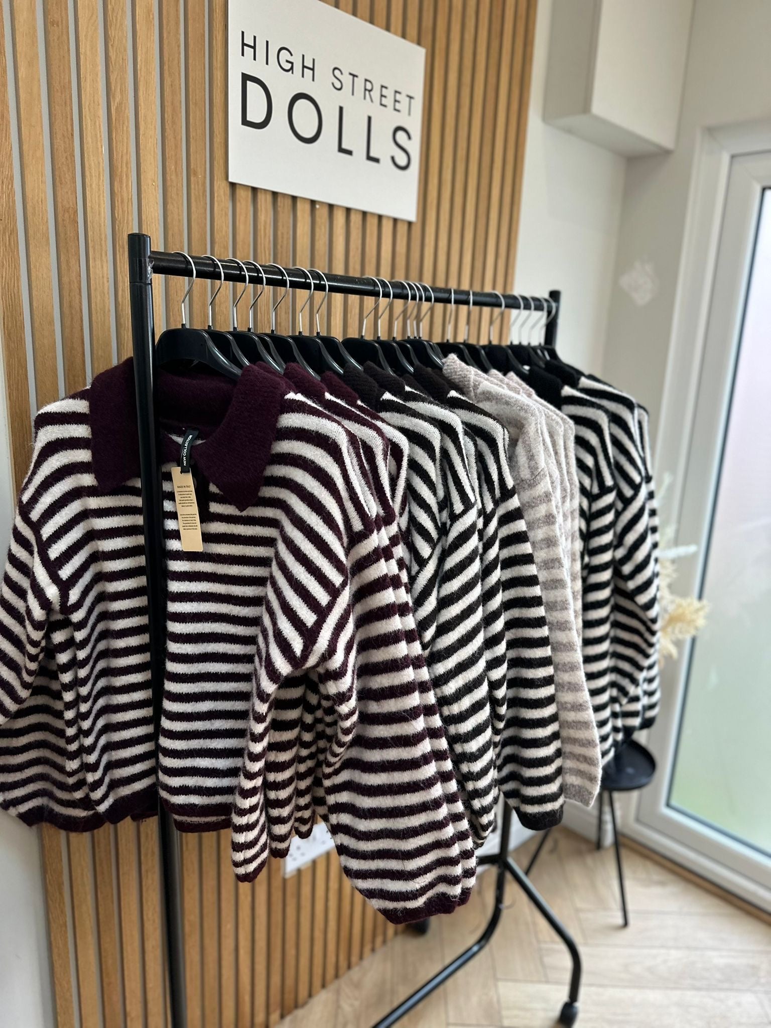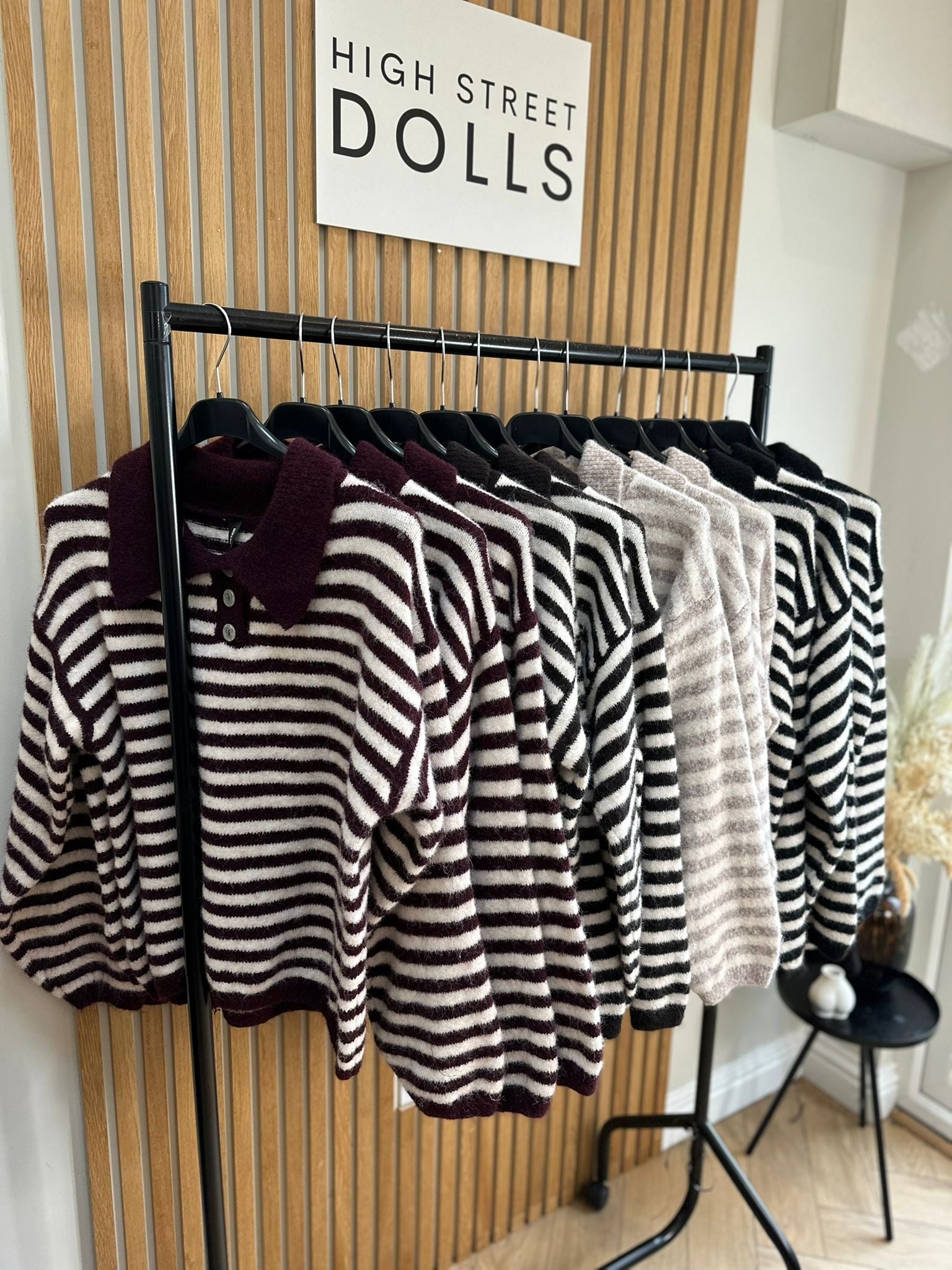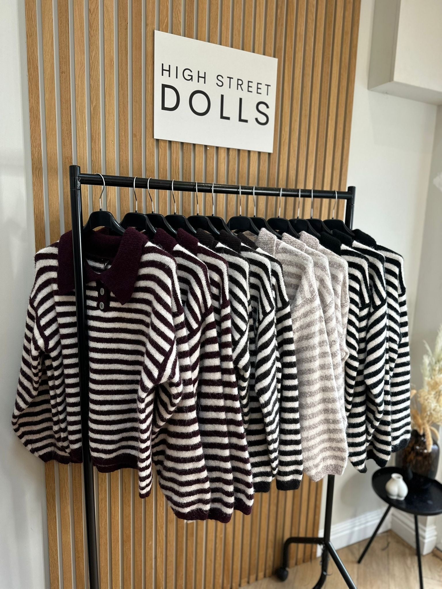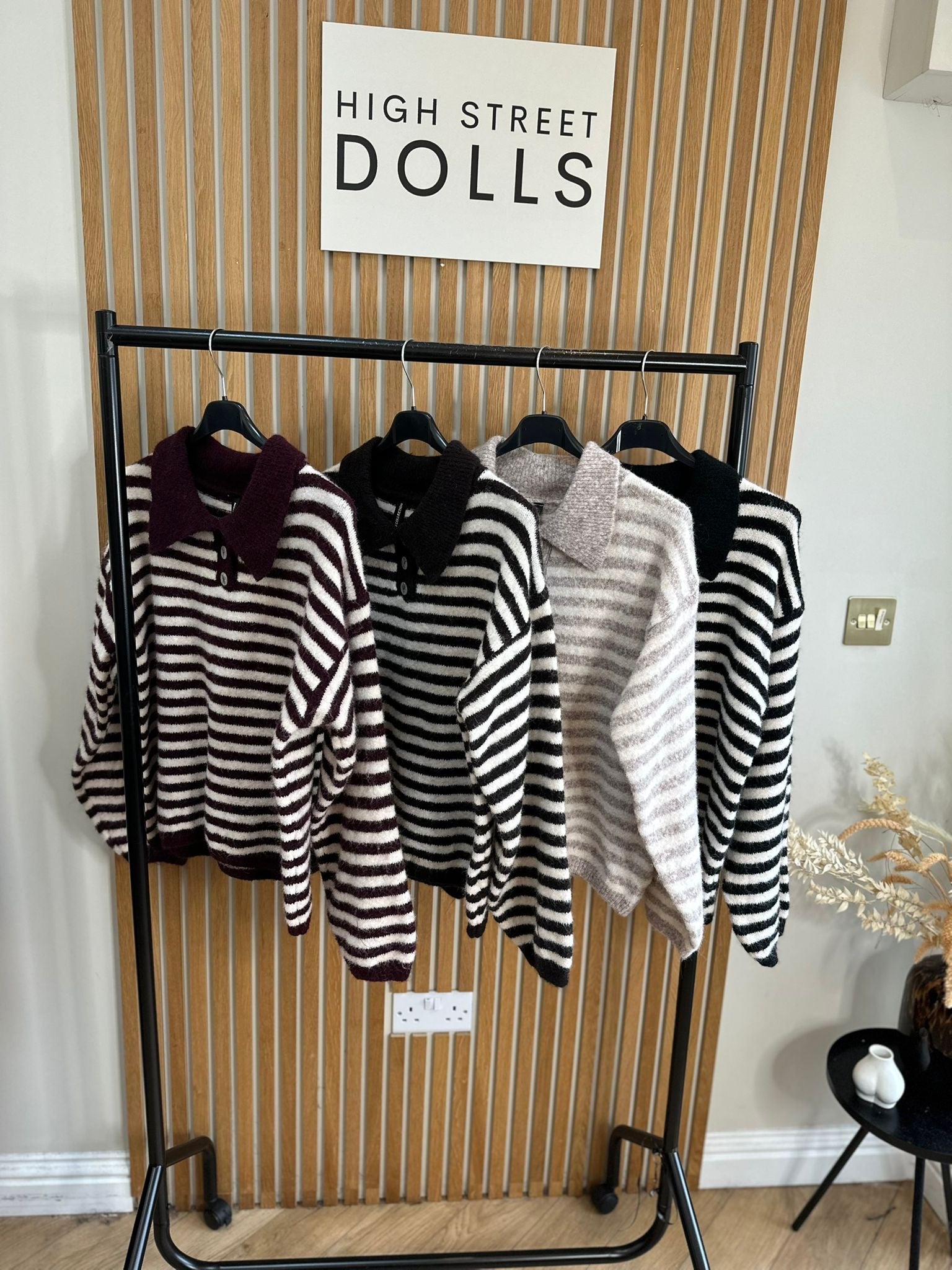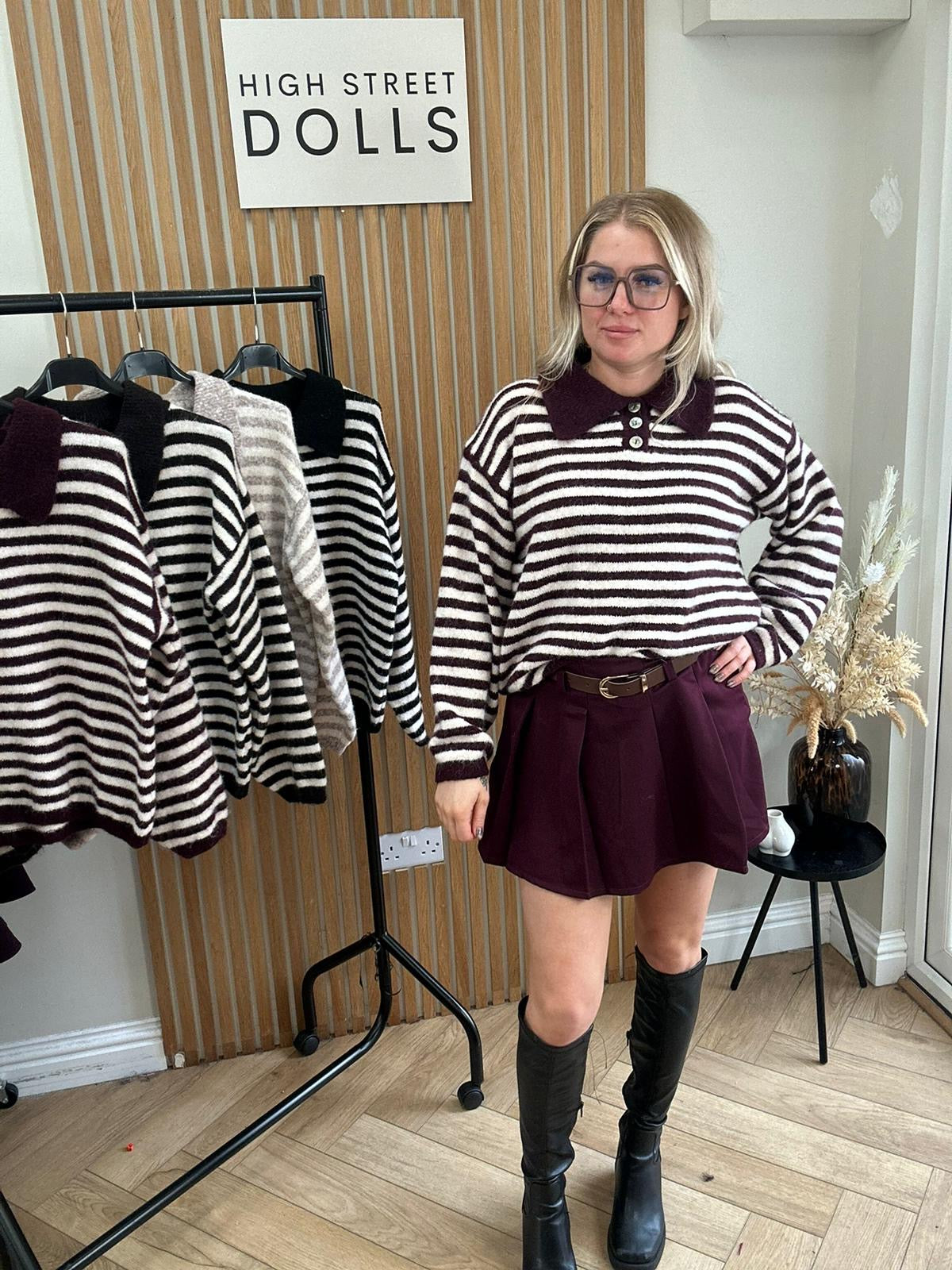Sara Knitted Jumper Stripe Detail Slouchy Knitwear Button Up with Collar Autumn Winter