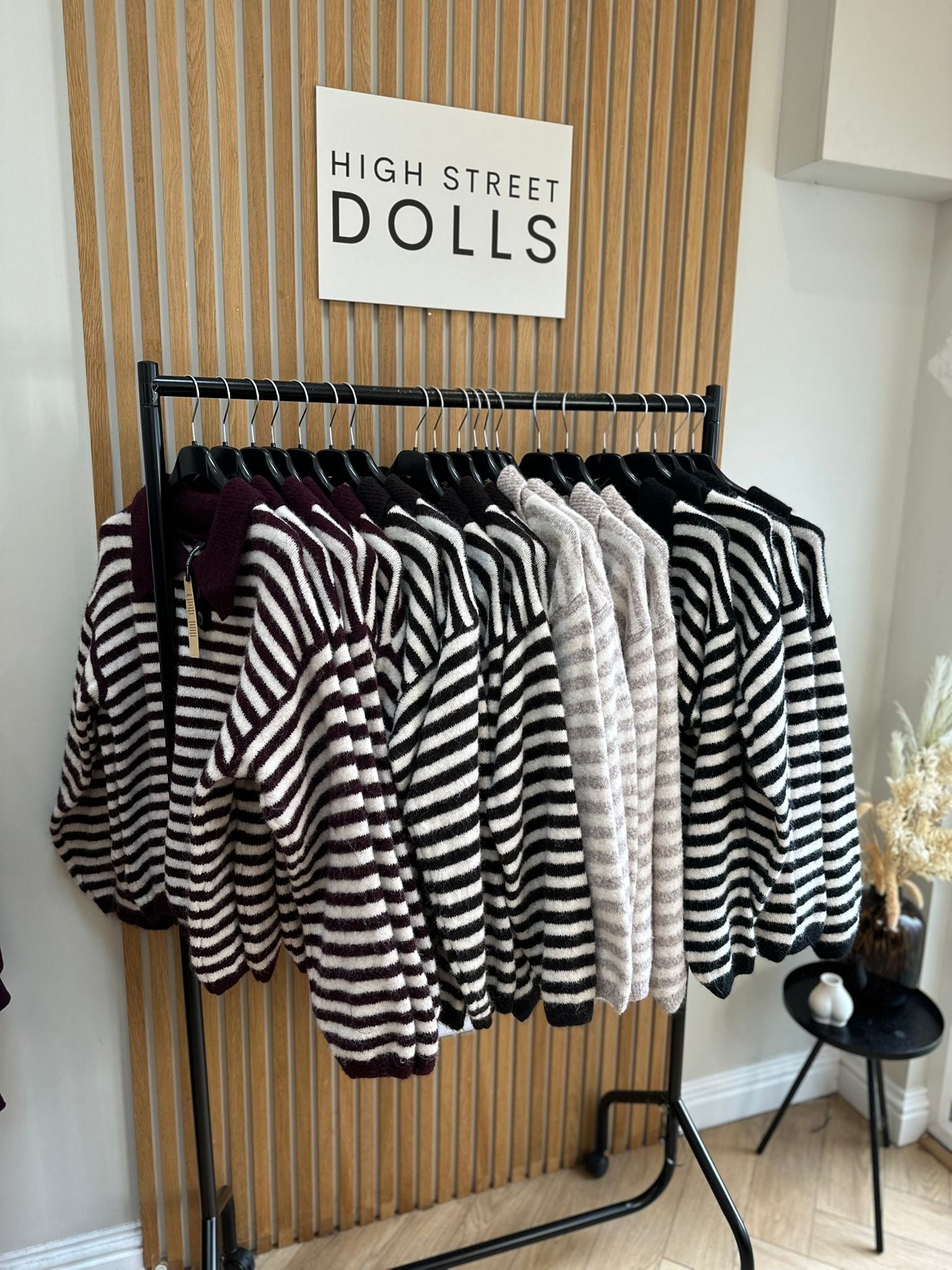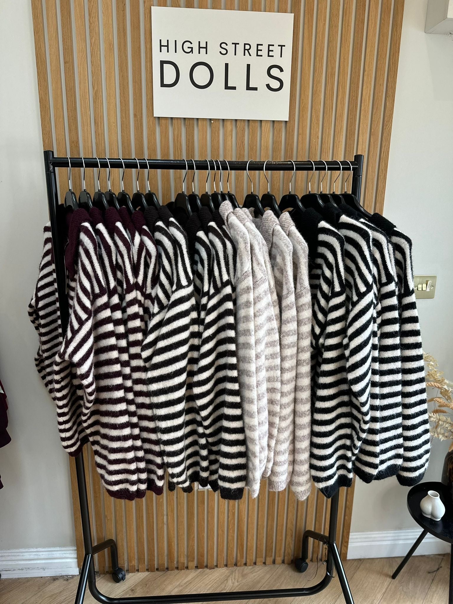 Stay cozy and stylish in the Sara Striped Knitted Jumper. This slouchy jumper features stunning stripe detail for a unique touch. Dress it up with a cute mini skirt or rock it with jeans or leggings. Dolls, this jumper is a must-have!